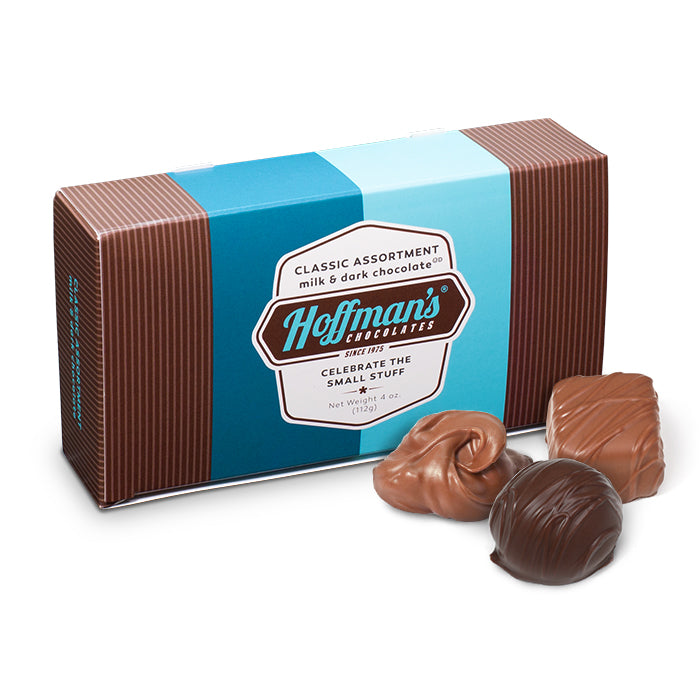 Looking for a gift for someone special, a thank-you to remember or an indulgence for yourself? Enjoy a quarter pound of confections covered in our signature milk and dark chocolate blend. This assortment includes our famous Almond Butter Crunch (creamy butter-roasted almonds and sugar cooked in a copper kettle, then hand-cut and enrobed in luscious Hoffman's premium chocolate and sprinkled with almonds), chewy Pecan Jitterbugs® (crafted from a mixture of creamy caramel blended with fresh Georgia pecans and enrobed with our silky), creams, caramels, nut clusters, marshmallows, and much more. This quarter-pound box makes a perfect gift and is sure to please even the most discerning chocolate lover.