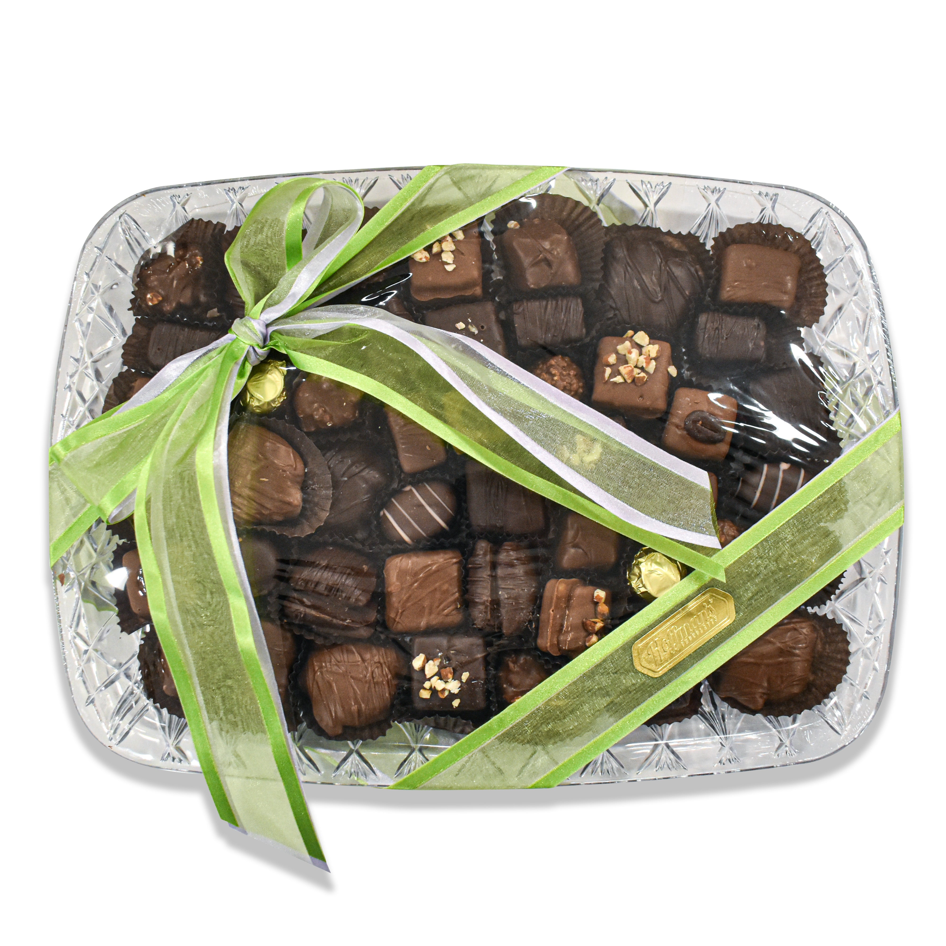 A gift for someone special. A thank-you to remember. An indulgence just for you. Enjoy two pounds of confections covered in our signature milk and dark chocolate blend. This assortment includes our famous Almond Butter Crunch (creamy butter-roasted almonds and sugar cooked in a copper kettle then hand-cut and enrobed in luscious Hoffman's premium chocolate and sprinkled with almonds), chewy Pecan Jitterbugs® (crafted from a mixture of creamy caramel blended with fresh Georgia pecans and enrobed with our silky chocolate), creams, caramels, nut clusters, marshmallows, and much more. This two-pound platter makes a perfect gift and is sure to please even the most discerning chocolate lover.