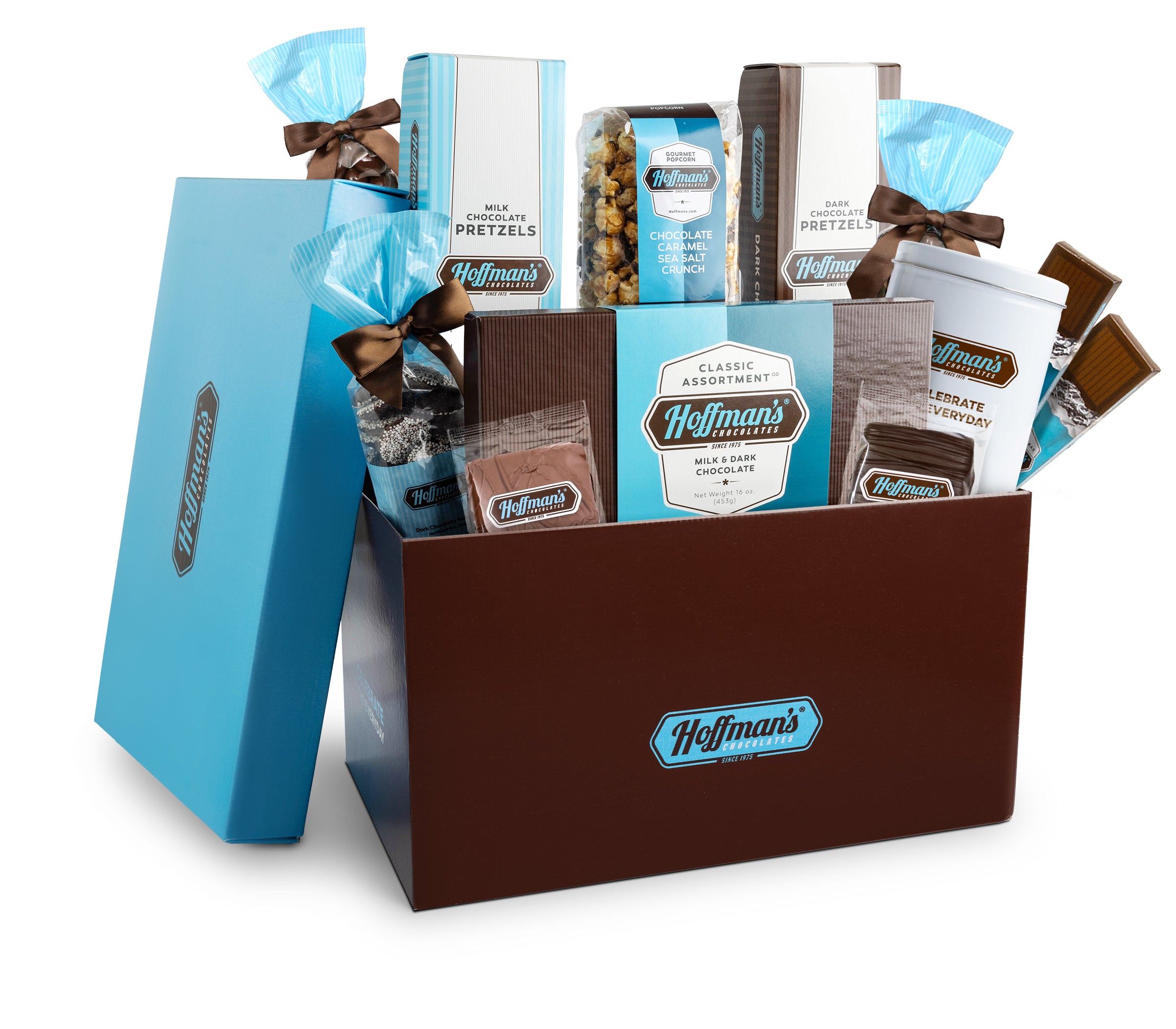 8 oz. Gourmet Caramel Popcorn, 8 oz. Dark Chocolate Nonpareils, Hoffman's Tin with 6 individually wrapped Milk Chocolate